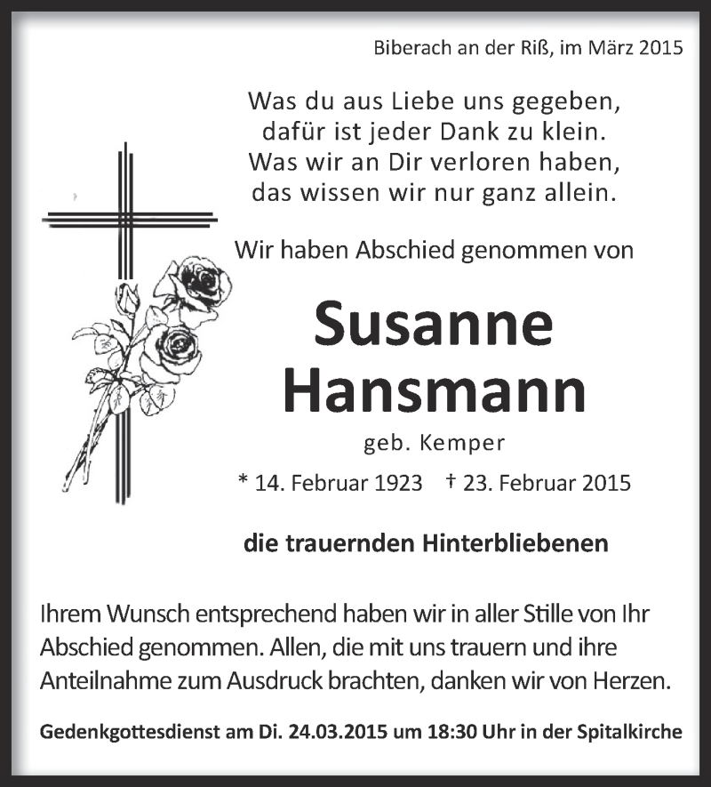 Hier finden Sie alle Traueranzeigen aus der Zeitung, die bisher für Susanne Hansmann erschienen sind. Weitere Traueranzeigen, die in der Zeitung erscheinen, werden hier ebenfalls aufgelistet