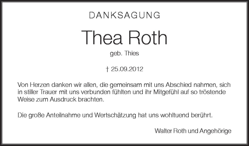 Hier finden Sie alle Traueranzeigen aus der Zeitung, die bisher für Thea Roth erschienen sind. Weitere Traueranzeigen, die in der Zeitung erscheinen, werden hier ebenfalls aufgelistet