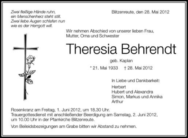 Hier finden Sie alle Traueranzeigen aus der Zeitung, die bisher für Theresia Behrendt erschienen sind. Weitere Traueranzeigen, die in der Zeitung erscheinen, werden hier ebenfalls aufgelistet
