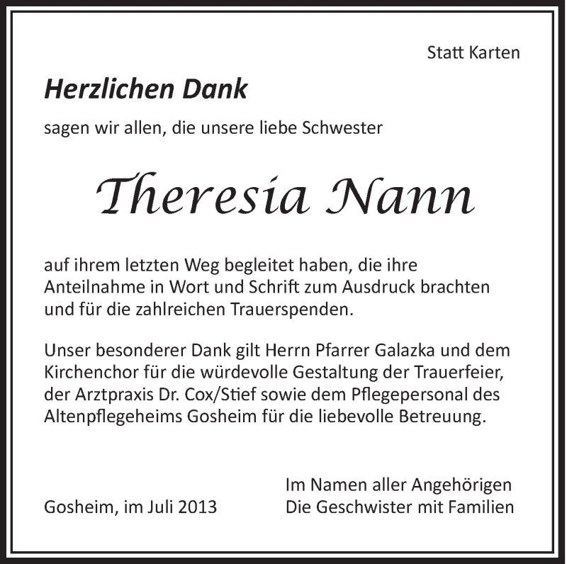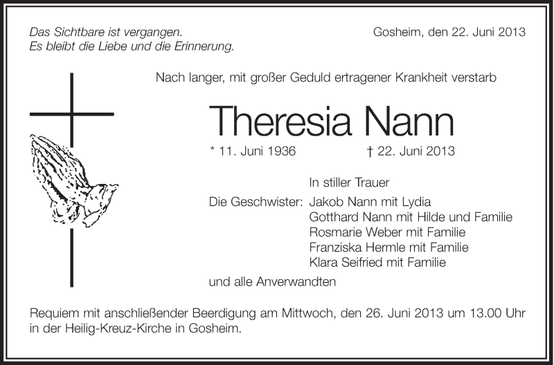 Hier finden Sie alle Traueranzeigen aus der Zeitung, die bisher für Theresia Nann erschienen sind. Weitere Traueranzeigen, die in der Zeitung erscheinen, werden hier ebenfalls aufgelistet