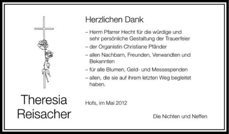 Hier finden Sie alle Traueranzeigen aus der Zeitung, die bisher für Theresia Reisacher erschienen sind. Weitere Traueranzeigen, die in der Zeitung erscheinen, werden hier ebenfalls aufgelistet