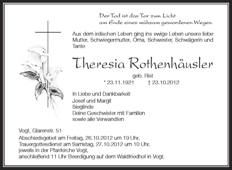Hier finden Sie alle Traueranzeigen aus der Zeitung, die bisher für Theresia Rothenhäusler erschienen sind. Weitere Traueranzeigen, die in der Zeitung erscheinen, werden hier ebenfalls aufgelistet