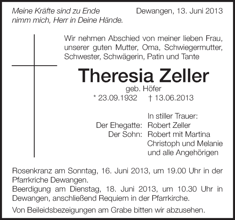 Hier finden Sie alle Traueranzeigen aus der Zeitung, die bisher für Theresia Zeller erschienen sind. Weitere Traueranzeigen, die in der Zeitung erscheinen, werden hier ebenfalls aufgelistet
