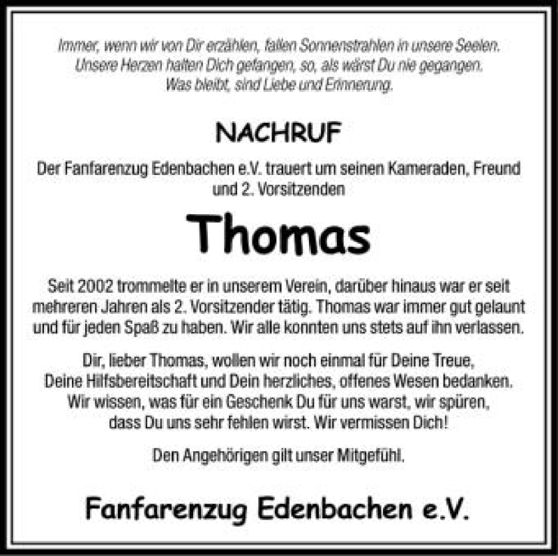 Hier finden Sie alle Traueranzeigen aus der Zeitung, die bisher für Thomas erschienen sind. Weitere Traueranzeigen, die in der Zeitung erscheinen, werden hier ebenfalls aufgelistet
