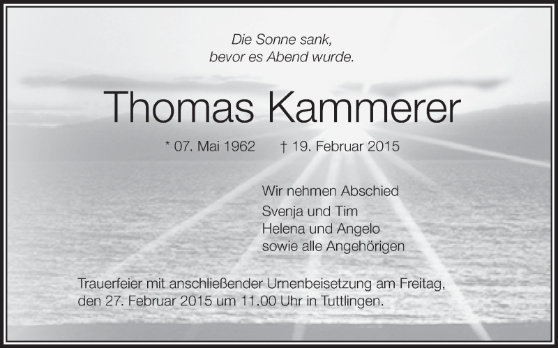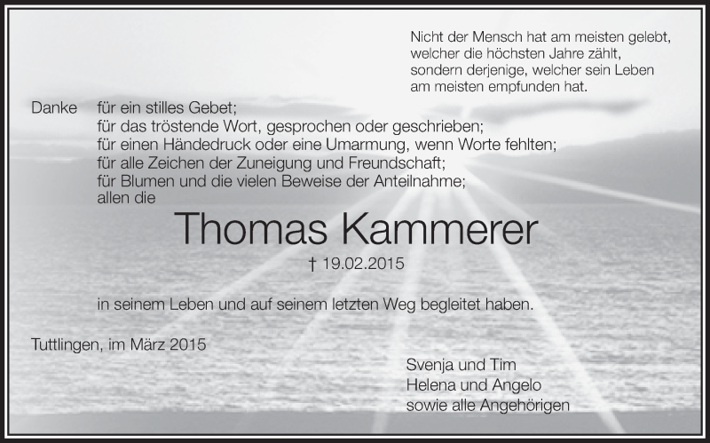 Hier finden Sie alle Traueranzeigen aus der Zeitung, die bisher für Thomas Kammerer erschienen sind. Weitere Traueranzeigen, die in der Zeitung erscheinen, werden hier ebenfalls aufgelistet