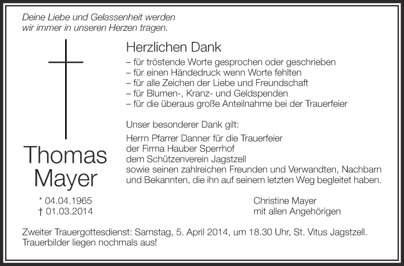 Hier finden Sie alle Traueranzeigen aus der Zeitung, die bisher für Thomas Mayer erschienen sind. Weitere Traueranzeigen, die in der Zeitung erscheinen, werden hier ebenfalls aufgelistet