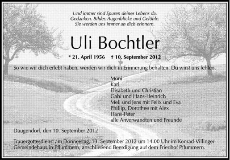 Hier finden Sie alle Traueranzeigen aus der Zeitung, die bisher für Uli Bochtler erschienen sind. Weitere Traueranzeigen, die in der Zeitung erscheinen, werden hier ebenfalls aufgelistet