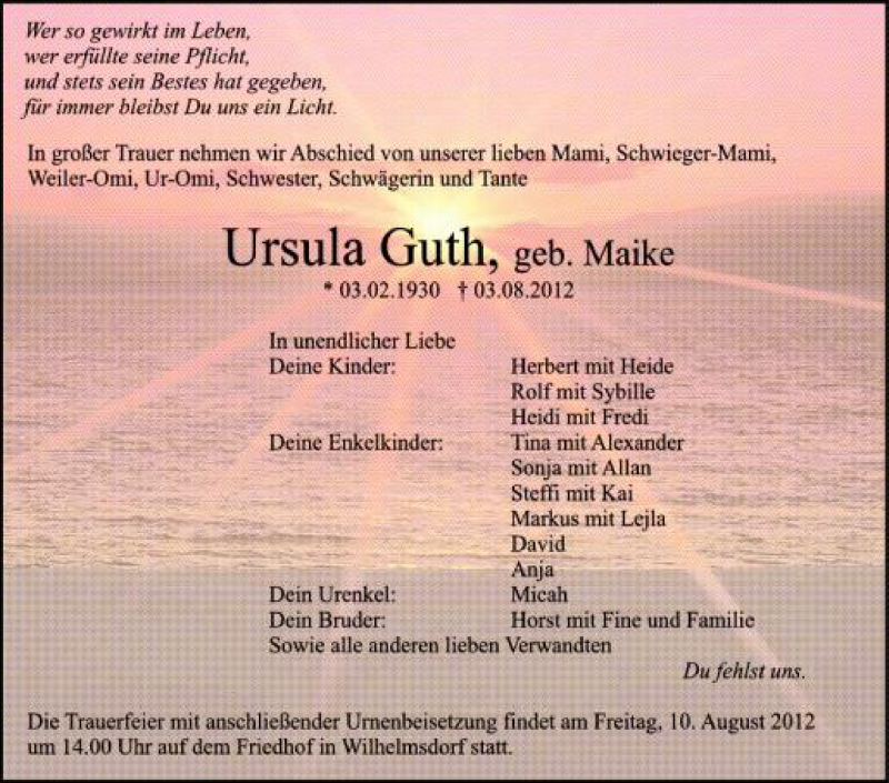 Hier finden Sie alle Traueranzeigen aus der Zeitung, die bisher für Ursula Guth erschienen sind. Weitere Traueranzeigen, die in der Zeitung erscheinen, werden hier ebenfalls aufgelistet