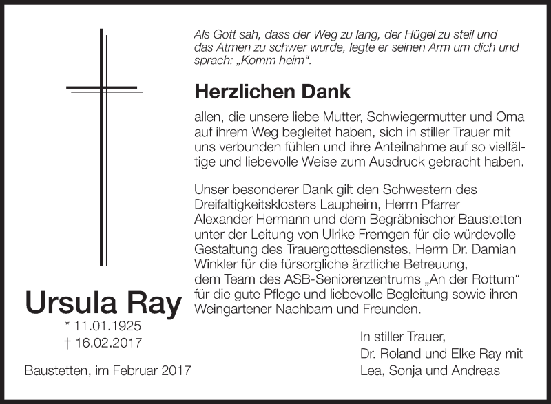 Hier finden Sie alle Traueranzeigen aus der Zeitung, die bisher für Ursula Ray erschienen sind. Weitere Traueranzeigen, die in der Zeitung erscheinen, werden hier ebenfalls aufgelistet