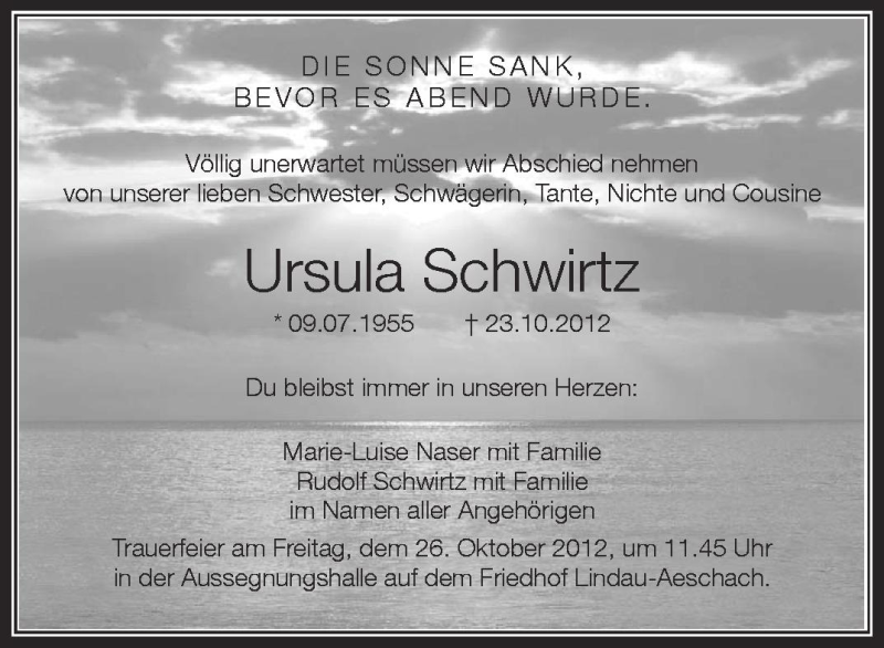 Hier finden Sie alle Traueranzeigen aus der Zeitung, die bisher für Ursula Schwirtz erschienen sind. Weitere Traueranzeigen, die in der Zeitung erscheinen, werden hier ebenfalls aufgelistet