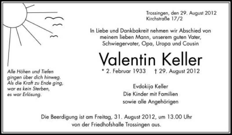 Hier finden Sie alle Traueranzeigen aus der Zeitung, die bisher für Valentin Keller erschienen sind. Weitere Traueranzeigen, die in der Zeitung erscheinen, werden hier ebenfalls aufgelistet