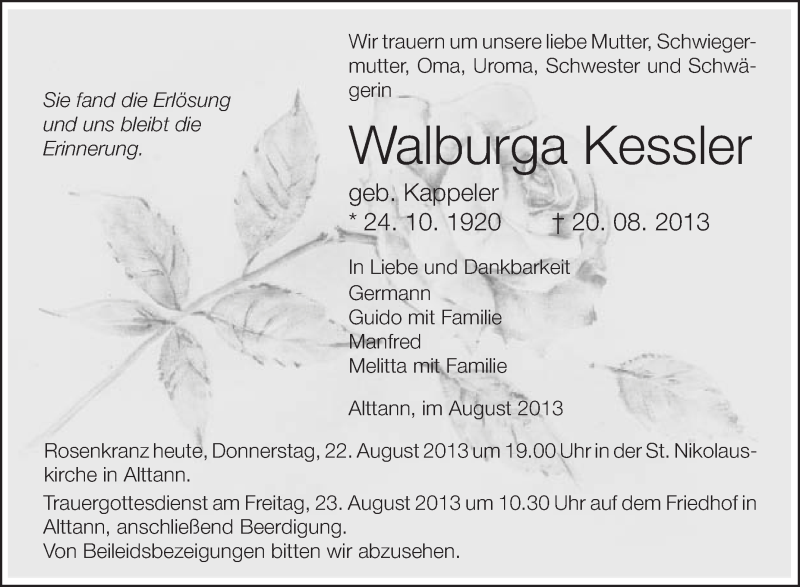 Hier finden Sie alle Traueranzeigen aus der Zeitung, die bisher für Walburga Kessler erschienen sind. Weitere Traueranzeigen, die in der Zeitung erscheinen, werden hier ebenfalls aufgelistet