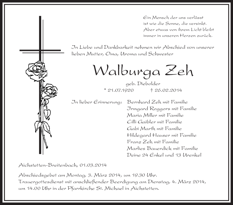 Hier finden Sie alle Traueranzeigen aus der Zeitung, die bisher für Walburga Zeh erschienen sind. Weitere Traueranzeigen, die in der Zeitung erscheinen, werden hier ebenfalls aufgelistet