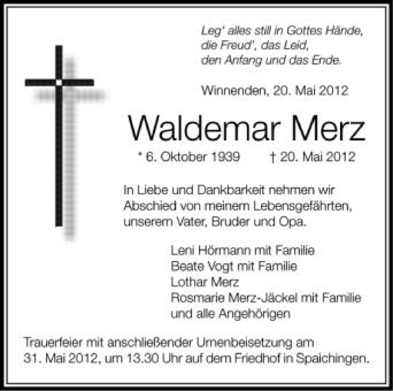 Hier finden Sie alle Traueranzeigen aus der Zeitung, die bisher für Waldemar Merz erschienen sind. Weitere Traueranzeigen, die in der Zeitung erscheinen, werden hier ebenfalls aufgelistet