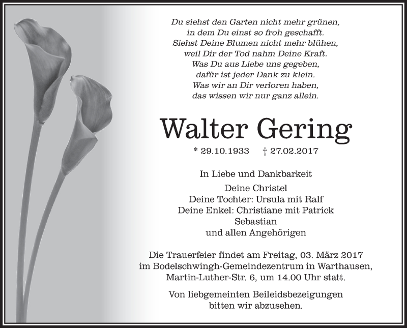 Hier finden Sie alle Traueranzeigen aus der Zeitung, die bisher für Walter Gering erschienen sind. Weitere Traueranzeigen, die in der Zeitung erscheinen, werden hier ebenfalls aufgelistet