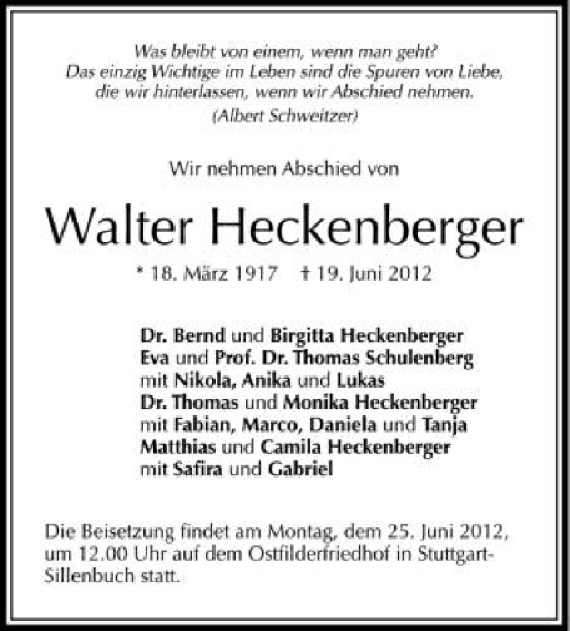 Hier finden Sie alle Traueranzeigen aus der Zeitung, die bisher für Walter Heckenberger erschienen sind. Weitere Traueranzeigen, die in der Zeitung erscheinen, werden hier ebenfalls aufgelistet