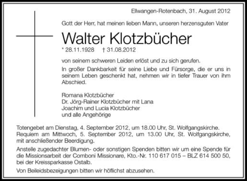 Hier finden Sie alle Traueranzeigen aus der Zeitung, die bisher für Walter Klotzbücher erschienen sind. Weitere Traueranzeigen, die in der Zeitung erscheinen, werden hier ebenfalls aufgelistet