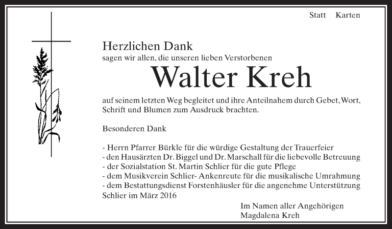 Hier finden Sie alle Traueranzeigen aus der Zeitung, die bisher für Walter Kreh erschienen sind. Weitere Traueranzeigen, die in der Zeitung erscheinen, werden hier ebenfalls aufgelistet