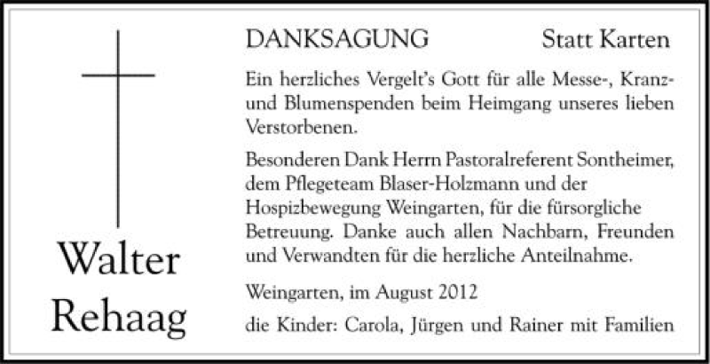 Hier finden Sie alle Traueranzeigen aus der Zeitung, die bisher für Walter Rehaag erschienen sind. Weitere Traueranzeigen, die in der Zeitung erscheinen, werden hier ebenfalls aufgelistet