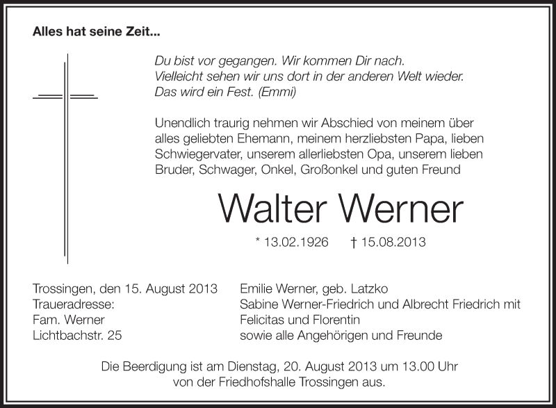 Hier finden Sie alle Traueranzeigen aus der Zeitung, die bisher für Walter Werner erschienen sind. Weitere Traueranzeigen, die in der Zeitung erscheinen, werden hier ebenfalls aufgelistet