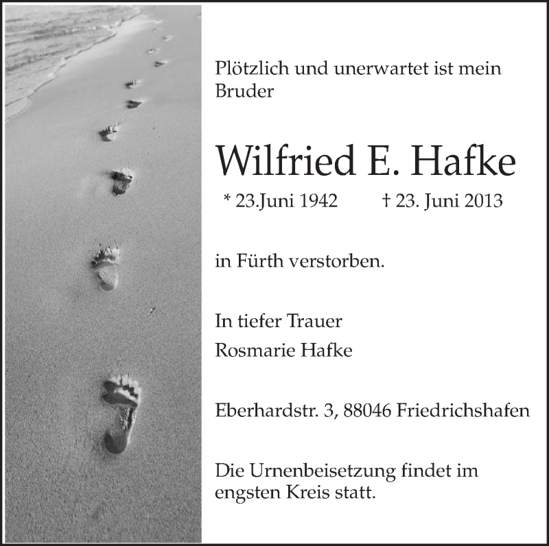 Hier finden Sie alle Traueranzeigen aus der Zeitung, die bisher für Wilfried Hafke erschienen sind. Weitere Traueranzeigen, die in der Zeitung erscheinen, werden hier ebenfalls aufgelistet