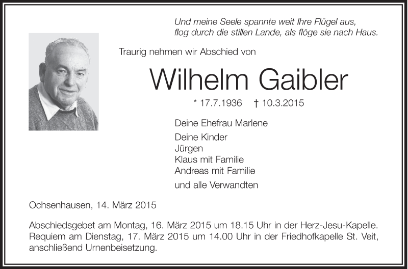 Hier finden Sie alle Traueranzeigen aus der Zeitung, die bisher für Wilhelm Gaibler erschienen sind. Weitere Traueranzeigen, die in der Zeitung erscheinen, werden hier ebenfalls aufgelistet