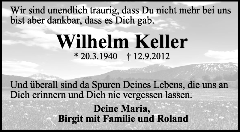 Hier finden Sie alle Traueranzeigen aus der Zeitung, die bisher für Wilhelm Keller erschienen sind. Weitere Traueranzeigen, die in der Zeitung erscheinen, werden hier ebenfalls aufgelistet