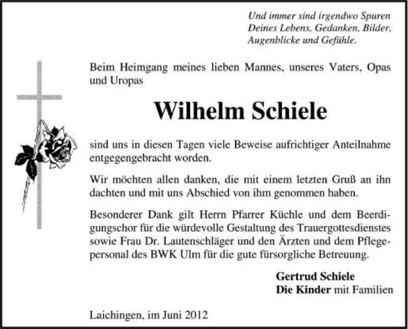 Hier finden Sie alle Traueranzeigen aus der Zeitung, die bisher für Wilhelm Schiele erschienen sind. Weitere Traueranzeigen, die in der Zeitung erscheinen, werden hier ebenfalls aufgelistet