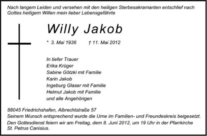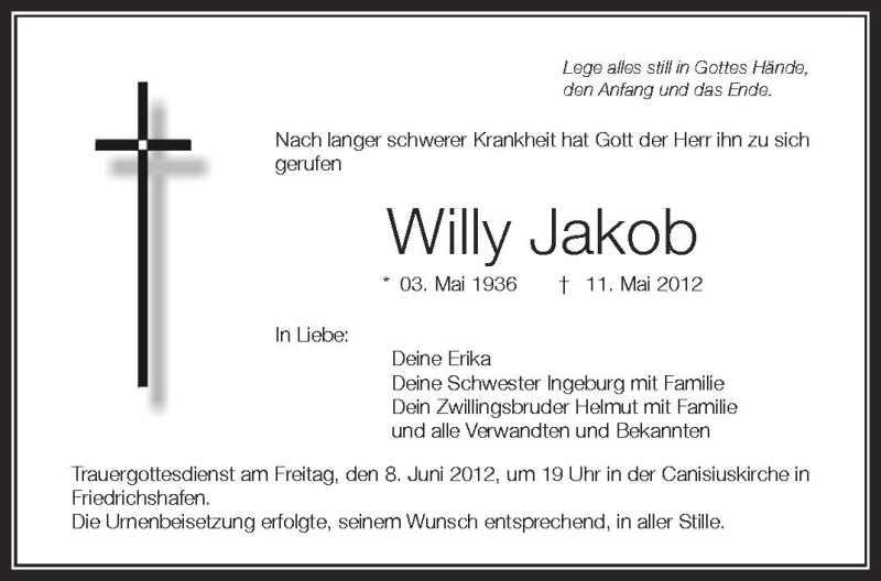 Hier finden Sie alle Traueranzeigen aus der Zeitung, die bisher für Willy Jakob erschienen sind. Weitere Traueranzeigen, die in der Zeitung erscheinen, werden hier ebenfalls aufgelistet