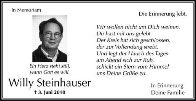 Hier finden Sie alle Traueranzeigen aus der Zeitung, die bisher für Willy Steinhauser erschienen sind. Weitere Traueranzeigen, die in der Zeitung erscheinen, werden hier ebenfalls aufgelistet