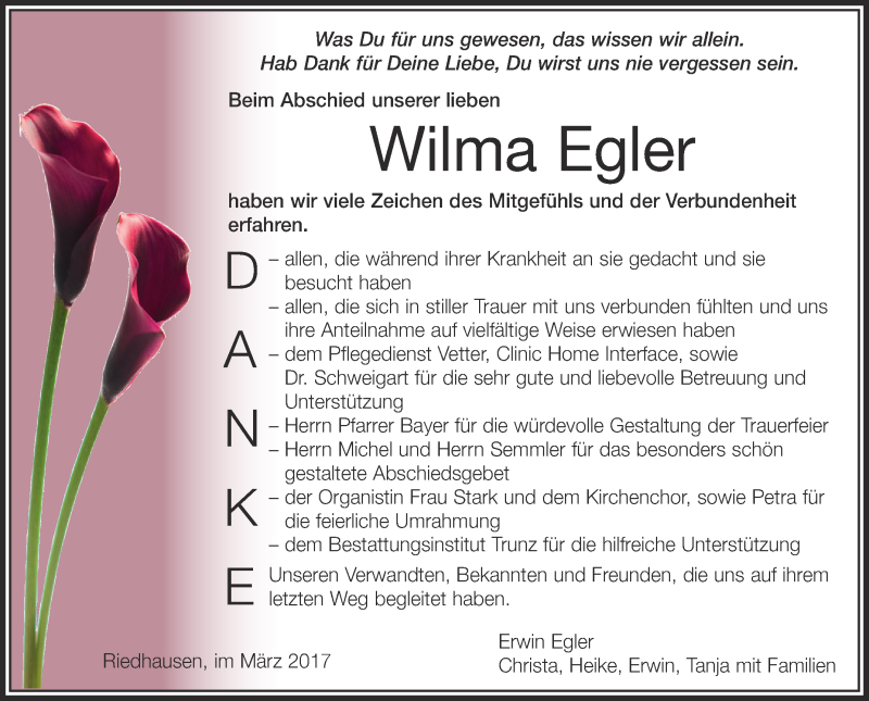 Hier finden Sie alle Traueranzeigen aus der Zeitung, die bisher für Wilma Egler erschienen sind. Weitere Traueranzeigen, die in der Zeitung erscheinen, werden hier ebenfalls aufgelistet