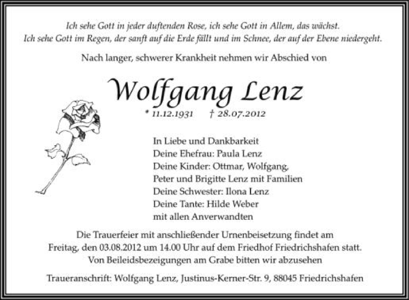 Hier finden Sie alle Traueranzeigen aus der Zeitung, die bisher für Wolfgang Lenz erschienen sind. Weitere Traueranzeigen, die in der Zeitung erscheinen, werden hier ebenfalls aufgelistet