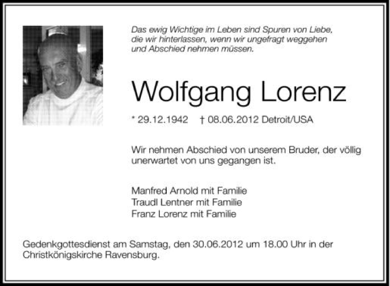 Hier finden Sie alle Traueranzeigen aus der Zeitung, die bisher für Wolfgang Lorenz erschienen sind. Weitere Traueranzeigen, die in der Zeitung erscheinen, werden hier ebenfalls aufgelistet
