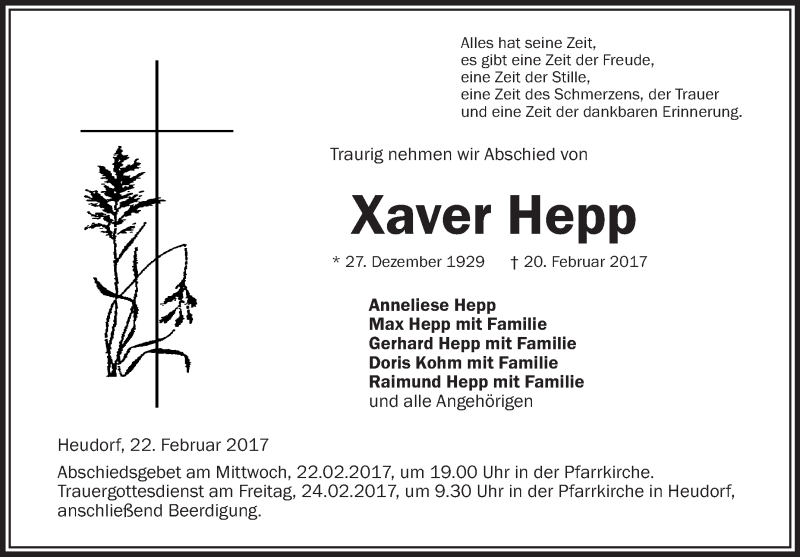 Hier finden Sie alle Traueranzeigen aus der Zeitung, die bisher für Xaver Hepp erschienen sind. Weitere Traueranzeigen, die in der Zeitung erscheinen, werden hier ebenfalls aufgelistet