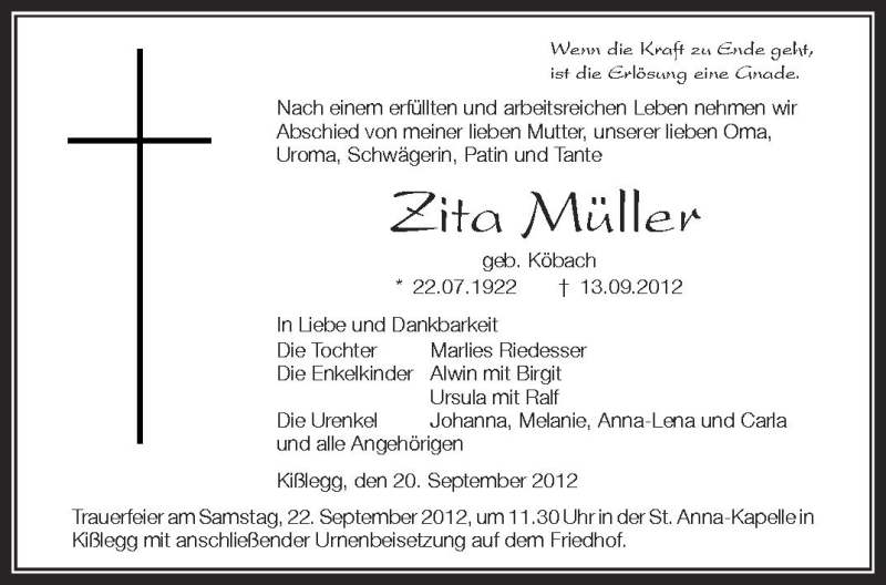 Hier finden Sie alle Traueranzeigen aus der Zeitung, die bisher für Zita Müller erschienen sind. Weitere Traueranzeigen, die in der Zeitung erscheinen, werden hier ebenfalls aufgelistet