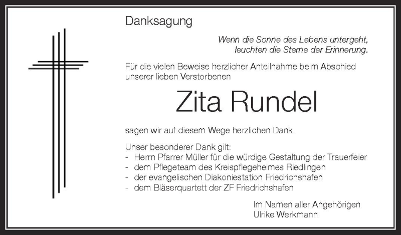 Hier finden Sie alle Traueranzeigen aus der Zeitung, die bisher für Zita Rundel erschienen sind. Weitere Traueranzeigen, die in der Zeitung erscheinen, werden hier ebenfalls aufgelistet